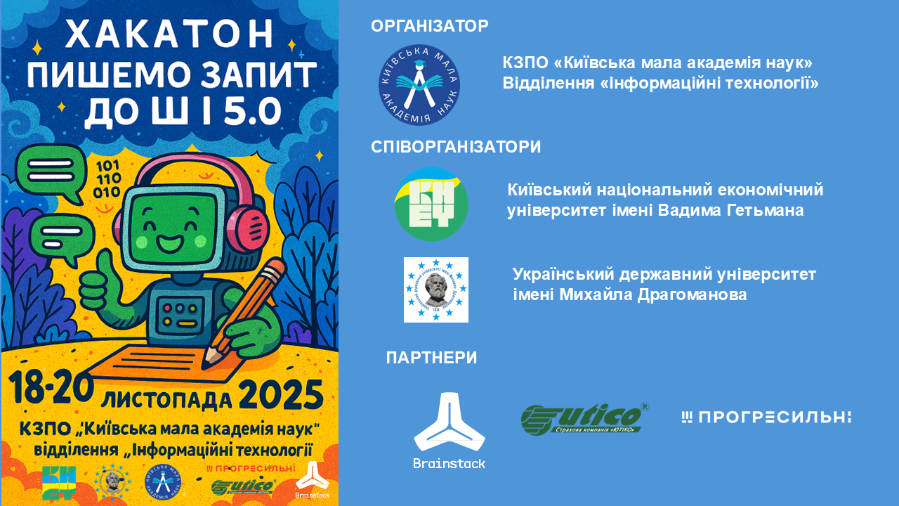 Про результати співпраці кафедри та КМАН – проведення Хакатону «Пишемо запит до ШІ 5.0»24 Листопада 2025р.![]() В рамках співпраці з КЗПО «Київська Мала академія наук учнівської молоді» представники кафедри штучного інтелекту, моделювання та статистики долучилися як представники журі Хакатону «Пишемо запит до ШІ 5.0», який вп’яте проводився відділенням інформаційних технологій КМАН впродовж 18-20 листопада 2025 року. 18 листопада команди розпочали роботу над завданням відбіркового етапу під назвою «Міжпредметний синтез ідей», суть якого полягала в тому, що команди мали використати промпт-інжиніринг, щоб об’єднати дві абсолютно різні навчальні дисципліни в одну та запропонувати в межах цієї нової дисципліни розв’язування актуальної глобальної проблеми. Серед 53 команд, що надіслали виконане завдання відбіркового етапу, журі обрало 10 команд фіналу, які на пітчингу представили результати виконаного завдання фіналу «ШІ-тьютор & дизайнер уроку 2030». Суть завдання полягала в тому, що потрібно за допомогою генеративного ШІ створити концепт ШІ-тьютора для школярів чи студентів через систему промптів до великої мовної моделі. Високий рівень виконання завдань командами Хакатону змушував журі кожного разу робити важкий вибір: або відібрати лише 10 команд у фінал, або обрати лише одного переможця та п’ять команд, які мали зайняти друге та третє місце. Детальніше про результати Хакатону «Пишемо запит до ШІ 5.0» на офіційному сайті КМАН: https://kman.kyiv.ua/ua/novyny/Rezultati-provedennya-Kakatonu-Pishemo-zapit-do-ShI-50 Кафедра ШІМС щиро вітає переможців Хакатону та вдячна викладачам кафедри Ользі Осиповій, Вікторії Кравченко, Володимиру Скіцьку, а також здобувачці третього року навчання ОП «Економічна кібернетика» Євгенії Сосновській за підтримку талановитої учнівської молоді. |