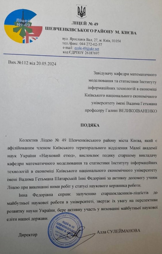20.05.2024 В рамках співробітництва кафедри математичного моделювання та статистики та Київською МАН оголошено результати конкурсу наукових досліджень20 Травня 2024р.![]() КАФЕДРА МАТЕМАТИЧНОГО МОДЕЛЮВАННЯ ТА СТАТИСТИКИ ПЛІДНО СПІВПРАЦЮЄ З ВІДДІЛЕННЯМ «ПРИКЛАДНОЇ МАТЕМАТИКИ» КИЇВСЬКОЇ МАН