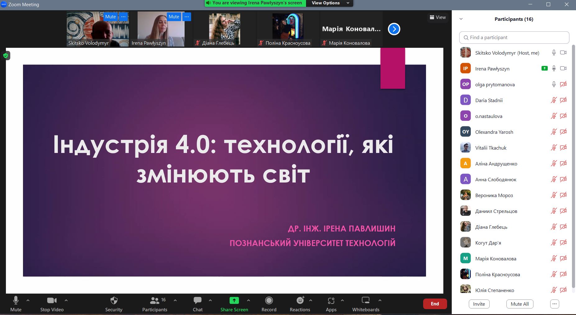 16 березня в рамках роботи наукового гуртка "Цифрові трансформації в економіці та суспільстві" відбулась зустріч з к.т.н., доцентом Познанського технологічного університету Іреною Павлишин на тему “Індустрія 4.0: технології, які змінюють світ”17 Березня 2023р.![]() В рамках роботи наукового гуртка (дискусійного клубу) «ЦифрЕк: цифрові трансформації в економіці та суспільстві», що діє на кафедрі математичного моделювання та статистики, 16 березня 2023 року відбулася онлайн зустріч з dr.inż. (к.т.н.) Іреною Павлишин, доцентом Інституту логістики Факультету інженерії менеджменту Познанського технологічного університету, Польща (Instytut Logistyki, Wydział Inżynierii Zarządzania, Politechniki Poznańskiej, Poland) на тему «Індустрія 4.0: технології, які змінюють світ». Модератор зустрічі: Володимир Скіцько, доцент кафедри математичного моделювання та статистики, Інститут інформаційних технологій в економіці, КНЕУ.