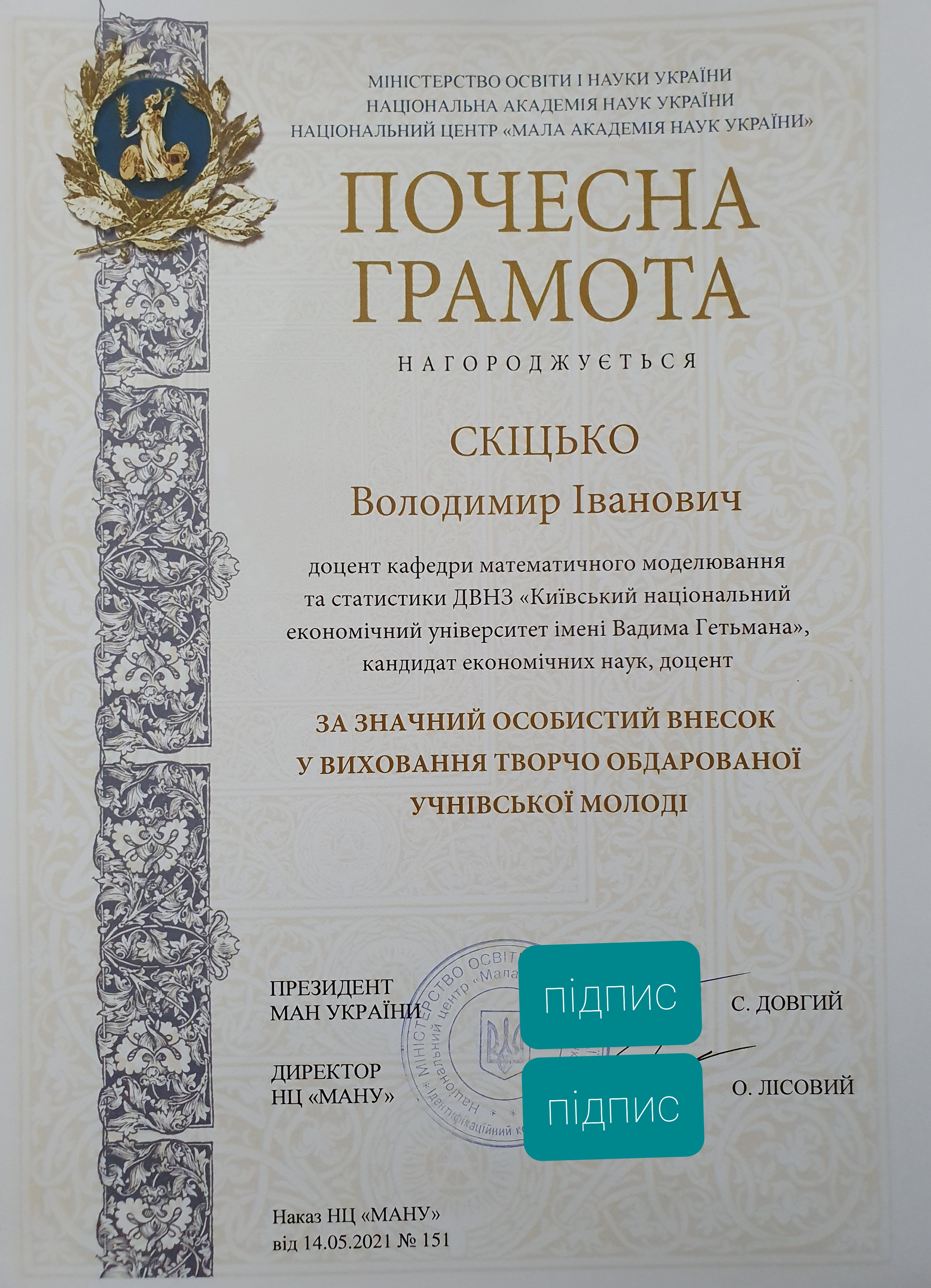 Вітаємо доцента кафедри Скіцька Володимира Івановича із нагородженням Почесною Грамотою Малої академії наук України за значний особистий внесок у виховання творчо обдарованої учнівської молоді!10 Червня 2021р.