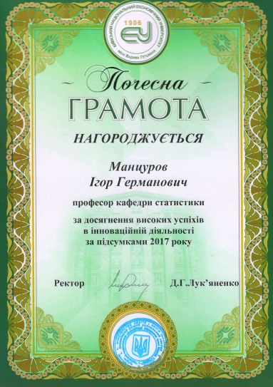 За досягнення високих результатів в інноваційній діяльності за підсумками 2017 року завідувача кафедри статистики, проф., д.е.н., член-кореспондента НАН України Манцурова Ігоря Германовича нагороджено грамотою. Результати інноваційної діяльності колективу кафедри статистики також високо оцінено: